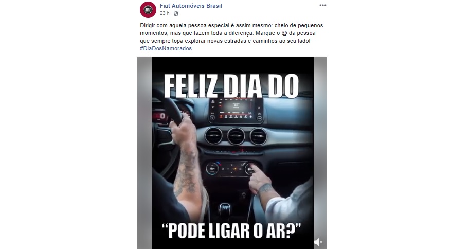 A comunicação online da Fiat em comemoração ao Dia dos Namorados celebrado, na última terça-feira,12, deu o que falar nas redes sociais. Põe pra carregar? Quem nunca soltou um pedido desses enquanto estava no carro com o namorado ou a namorada, com a intenção de pedir para “carregar o celular”, que atire a primeira pedra, né?