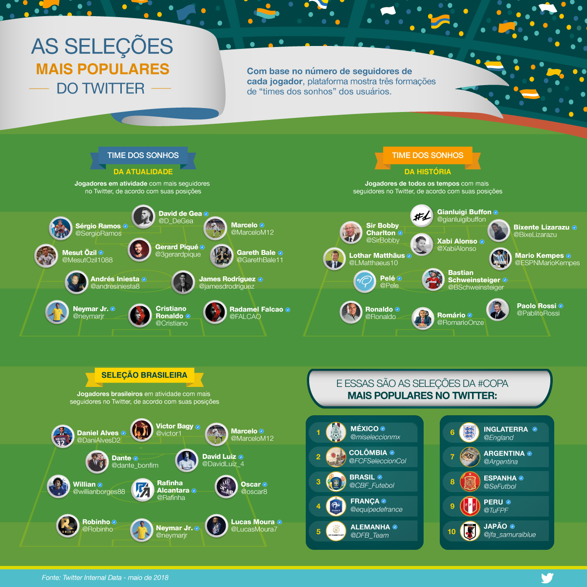 A menos de duas semanas da Copa do Mundo, que estreia no próximo dia 14, o Twitter preparou um infográfico para mostrar três formações de “times dos sonhos” dos usuários: o time dos sonhos da atualidade, o time dos sonhos da história e uma seleção de jogadores brasileiros em atividade.